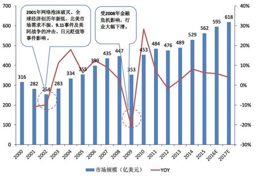 2000-2017年全球连接器市场销售额(单位:亿美元),来源Bishop&Associates
