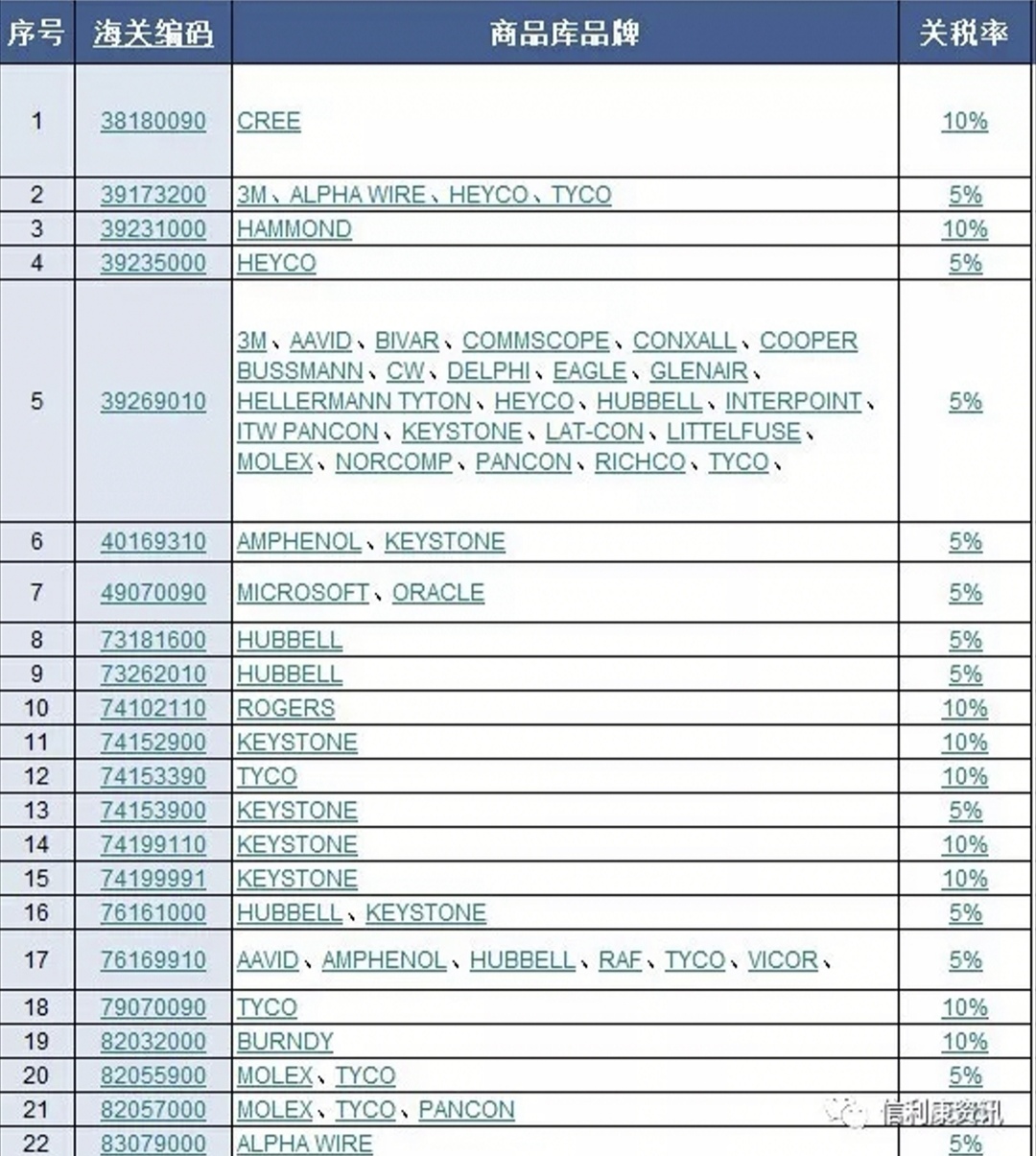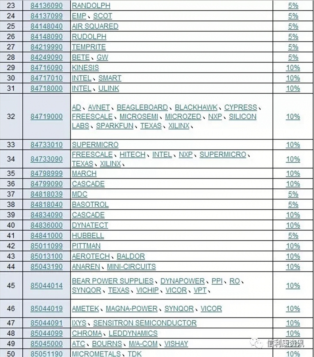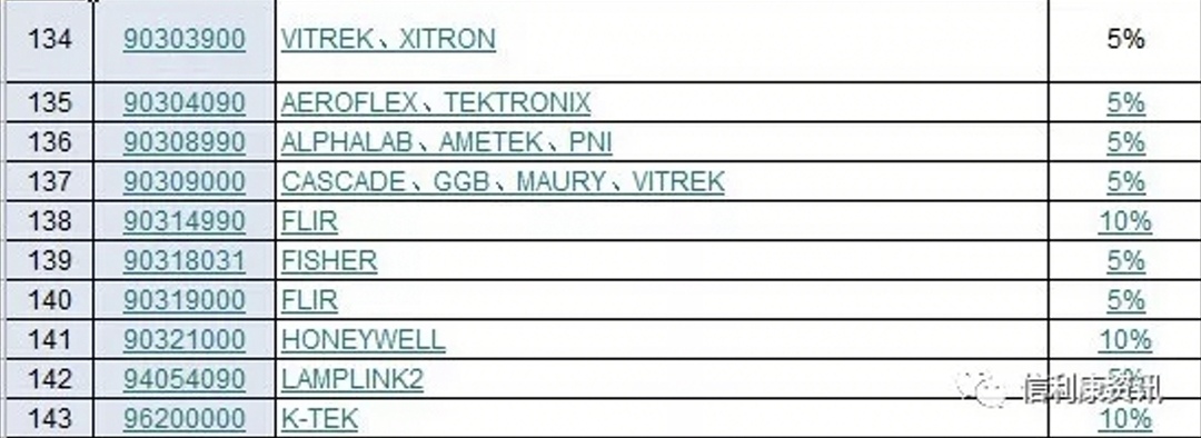 日前,供应链服务公司信利康根据历史自有数据整理分析中,指出此次受影响商品海关编码有143个,涉及商品品牌262个。国际电子商情记者看到,其中包括了CREE,TYCO,3M,MOLEX,安费诺,INTEL,CYPRESS,NXP,MICROSEMI,AVNET,VISHAY,AVX,KEMET,TDK,KINGSTON等等。可以说涉及品牌还是比较多的,但这部分产品涉及进口金额尚未知。