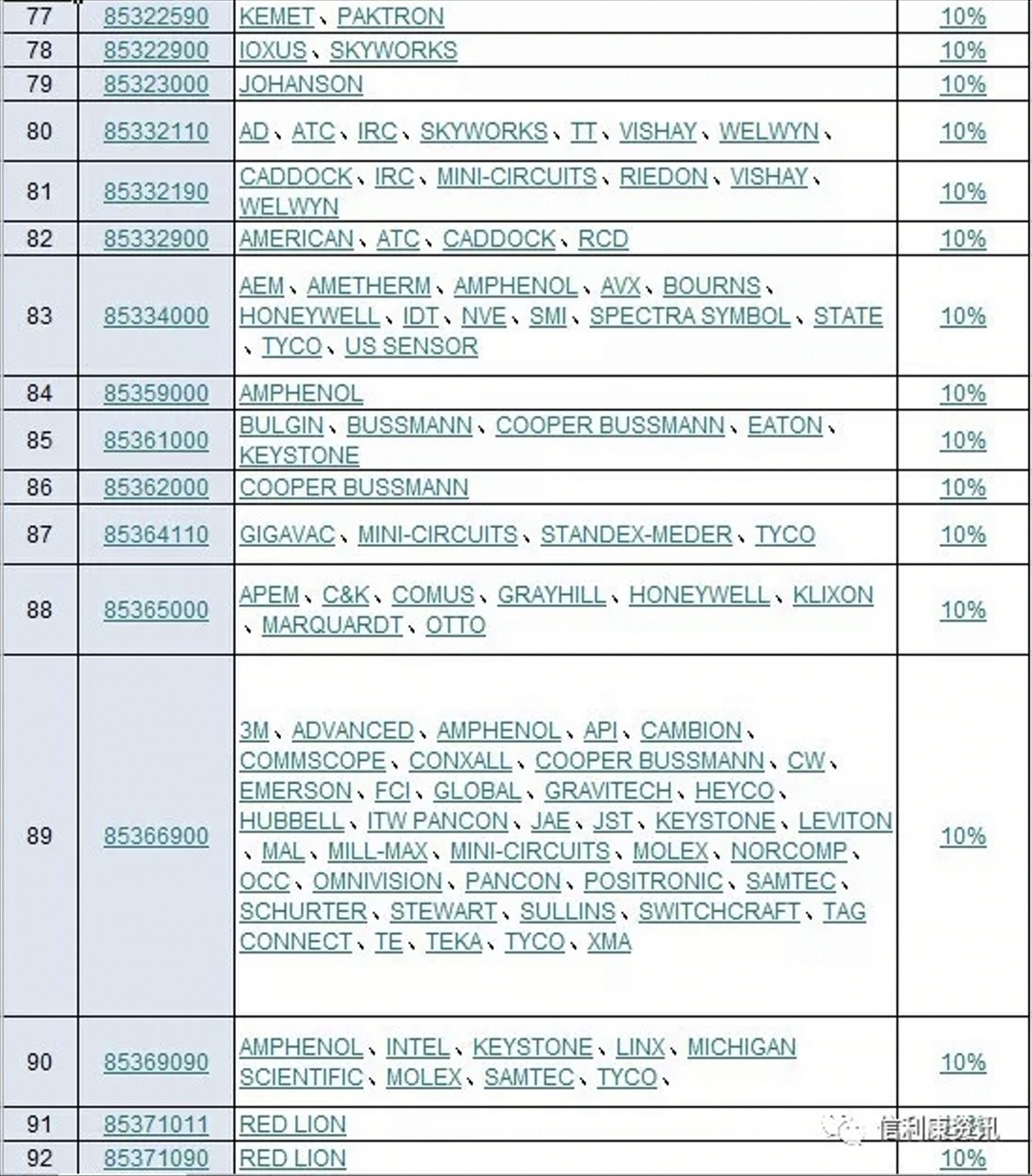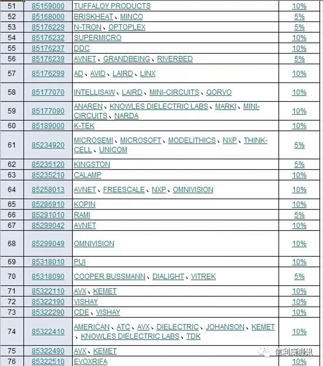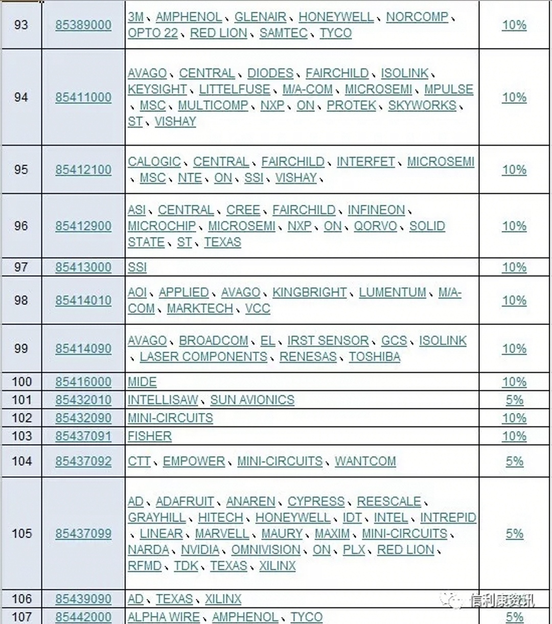 日前,供应链服务公司信利康根据历史自有数据整理分析中,指出此次受影响商品海关编码有143个,涉及商品品牌262个。国际电子商情记者看到,其中包括了CREE,TYCO,3M,MOLEX,安费诺,INTEL,CYPRESS,NXP,MICROSEMI,AVNET,VISHAY,AVX,KEMET,TDK,KINGSTON等等。可以说涉及品牌还是比较多的,但这部分产品涉及进口金额尚未知。