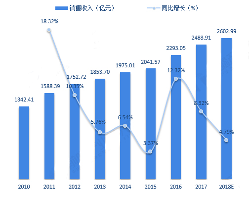 图12010-2018年中国连接器制造行业销售收入及增长(单位:亿元,%)