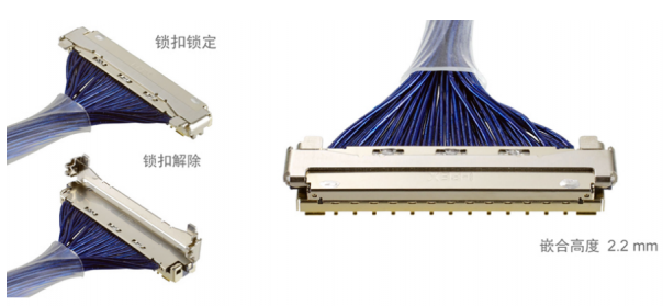 此款连接器为0.4mm间距,超小体积。嵌合高度为2.2 +/- 0.15 mm (带锁盖)及2.0 +/- 0.15 mm (不带锁盖)。电磁干扰屏蔽特性和多点接地设计,使该连接器与设备内部防噪波层组兼容,符合高速传输标准。这些特性淘汰了用于噪波控制的屏蔽胶带和/或单独的屏蔽罩。