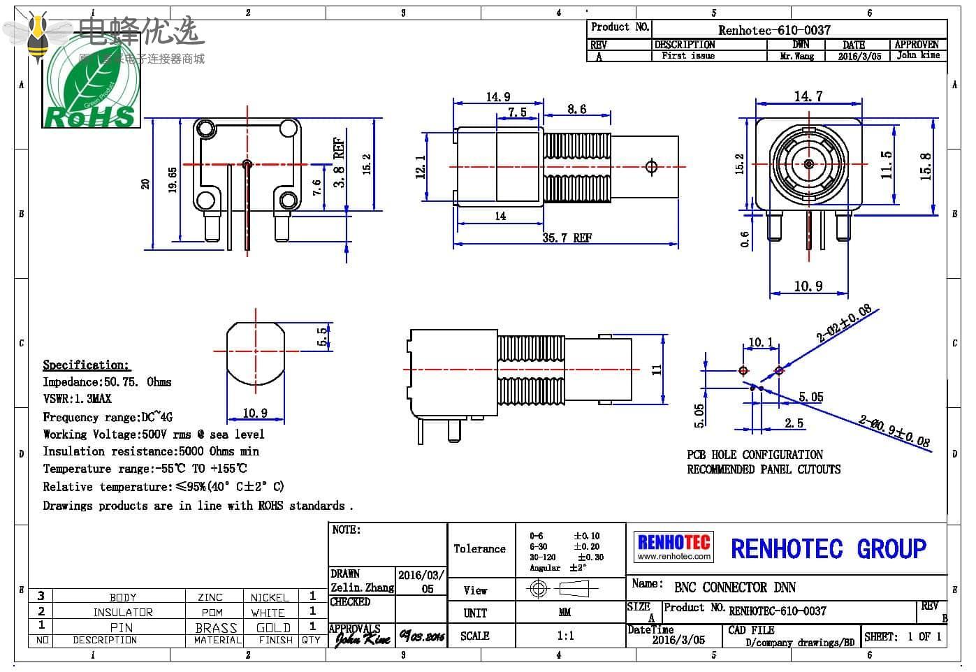 - PCB板端,母头,弯式,锌合金,RF射频同轴,BNC连接器,50欧姆,75欧;