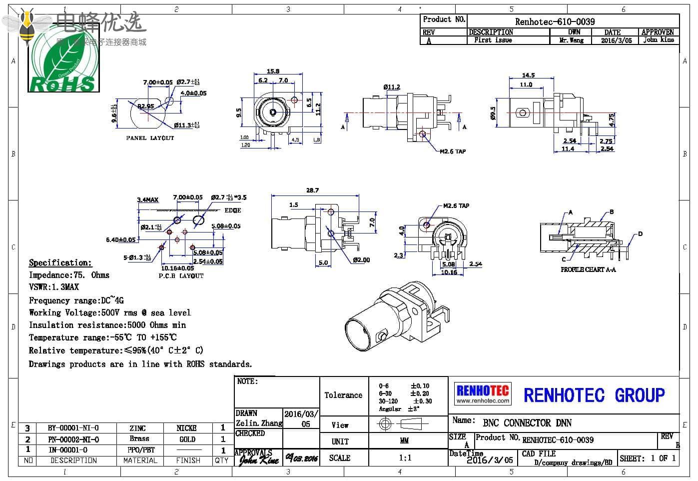 - PCB板端,母头,弯式,锌合金,RF射频同轴,BNC连接器,75欧姆;