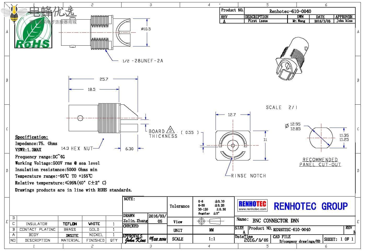 中心接触电阻:≦ 1.5 mΩ (Milliohms max.)