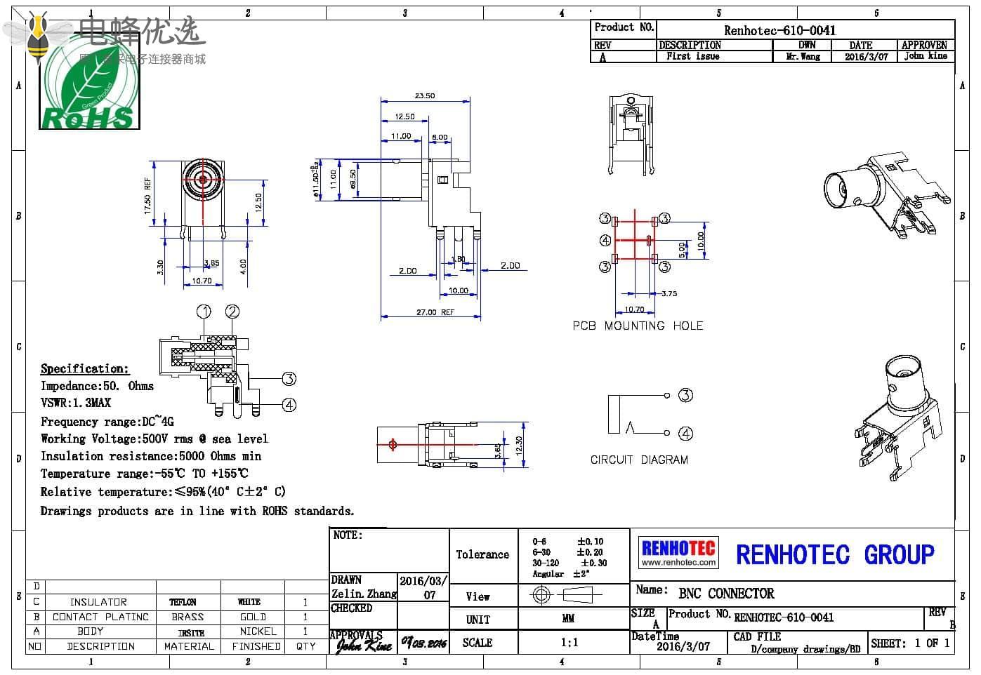 - PCB板端,母头,弯式,锌合金,RF射频同轴,BNC连接器,50欧姆;