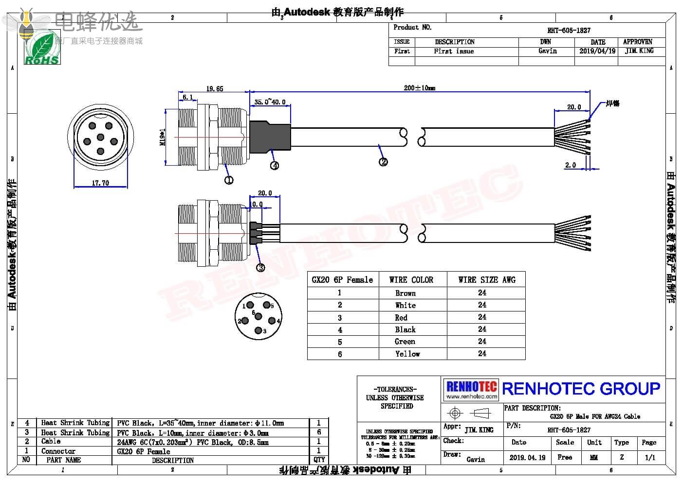 - GX20,常规款,线束,6芯,单边线,公头,直式,接线