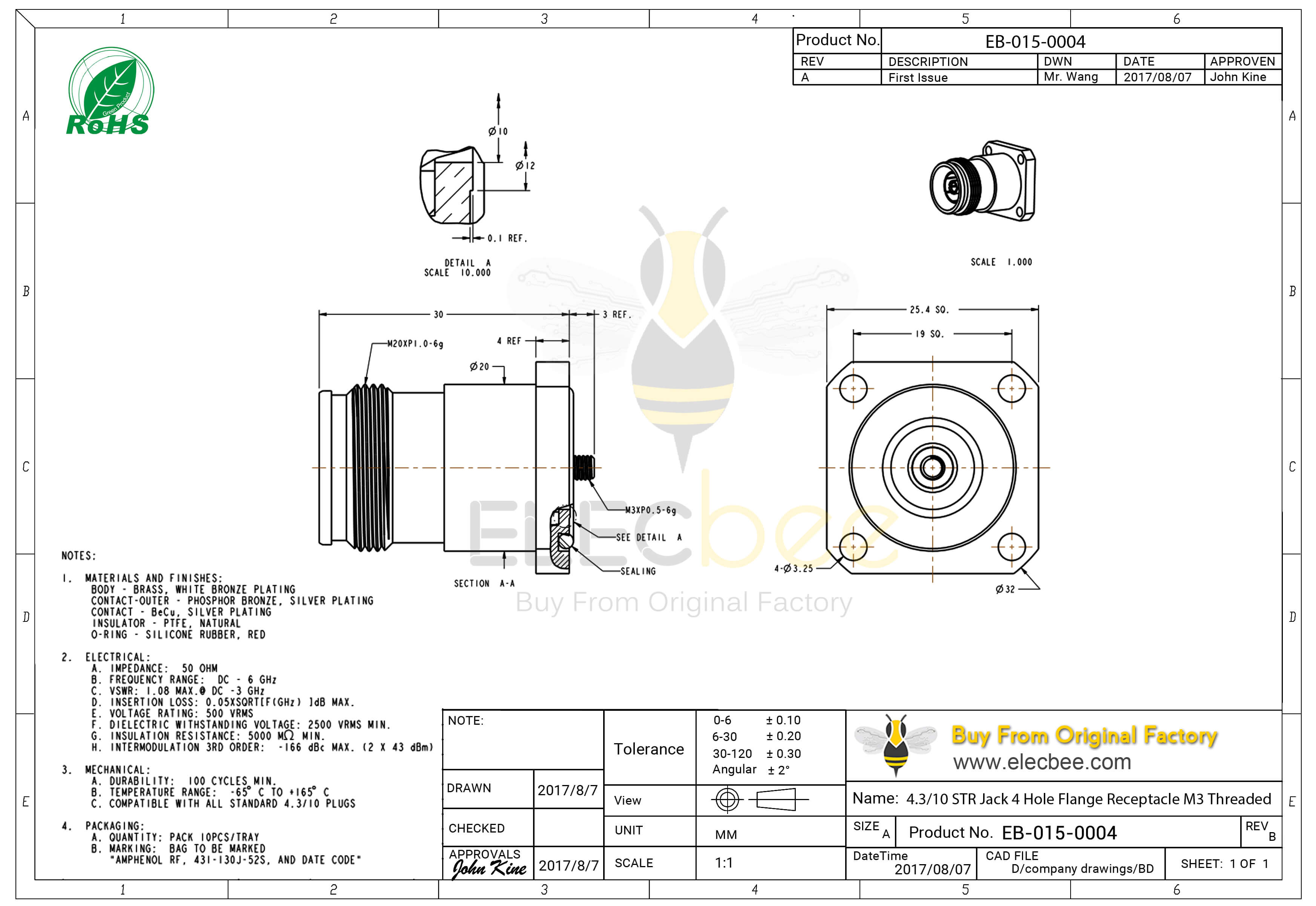 - RF连接器,4.3-10连接器,直式,母头,螺母锁紧,接线,四孔法兰,50欧姆