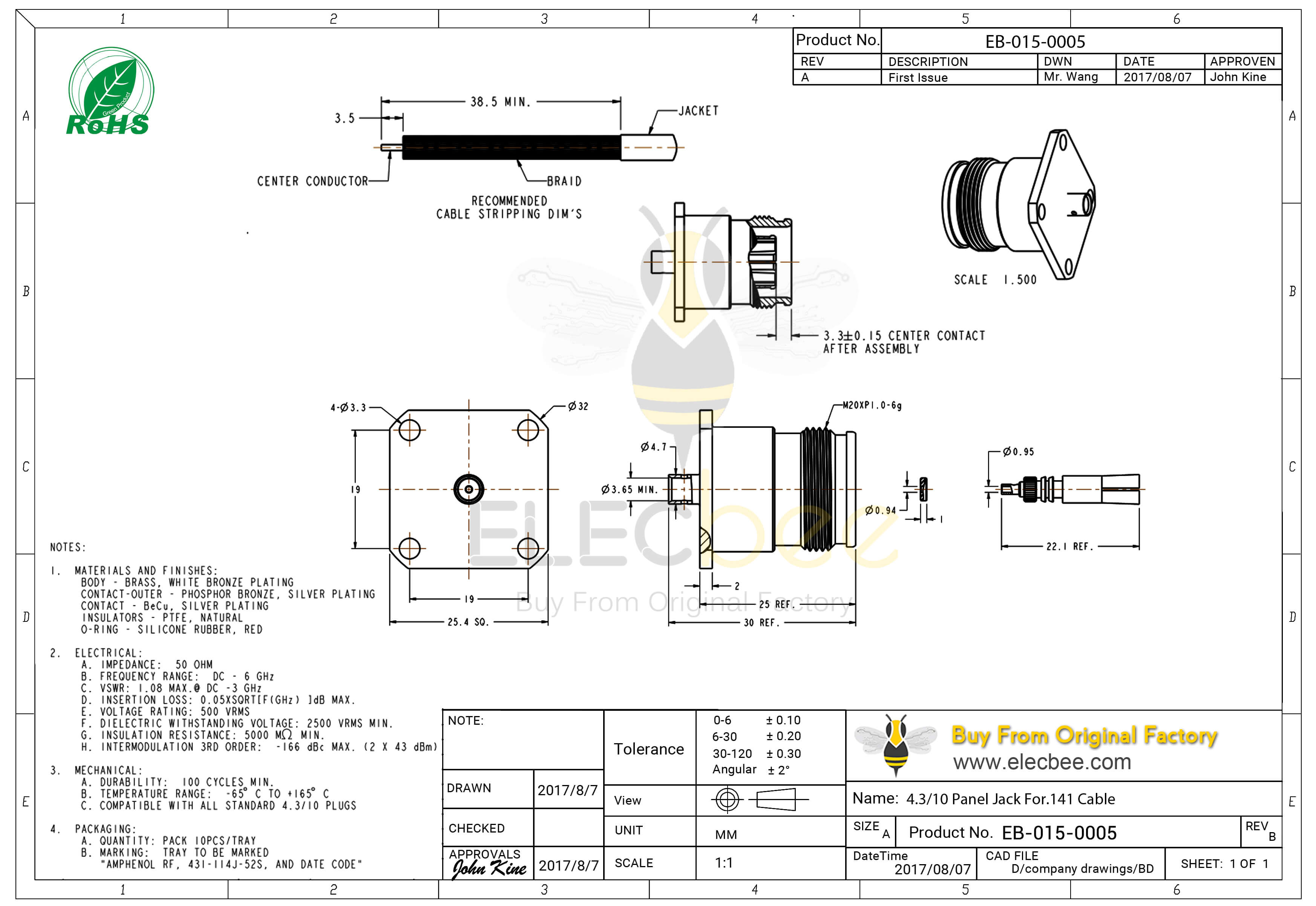 - RF连接器,4.3-10连接器,直式,母头,螺母锁紧,接.141" 半刚性线,四孔法兰,50欧姆