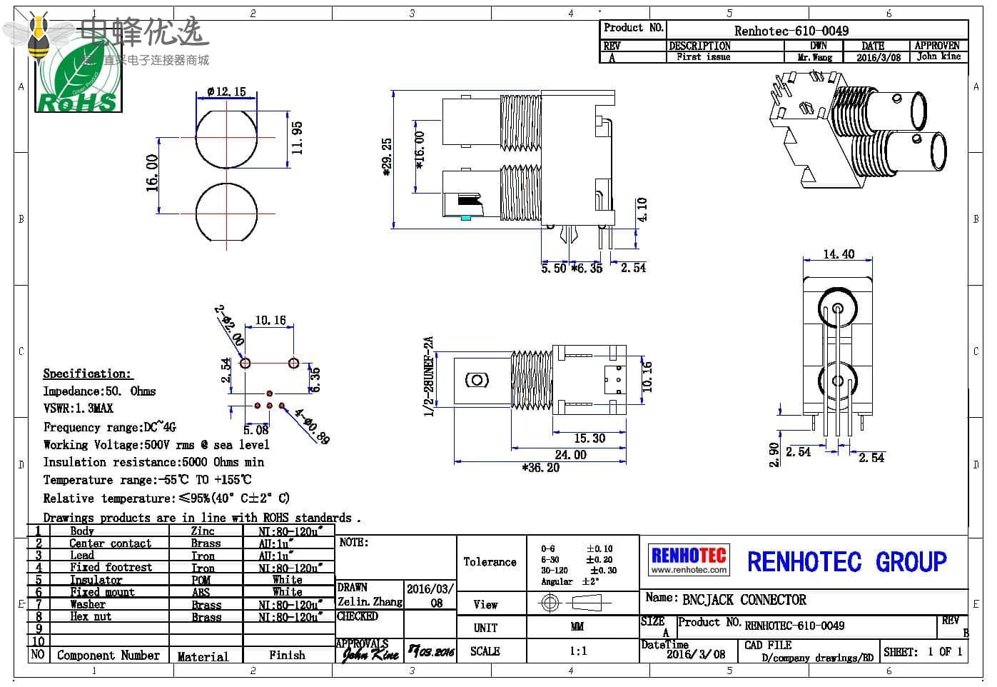 - PCB板端,母头,弯式,锌合金,RF射频同轴,BNC连接器,50欧姆,穿墙;