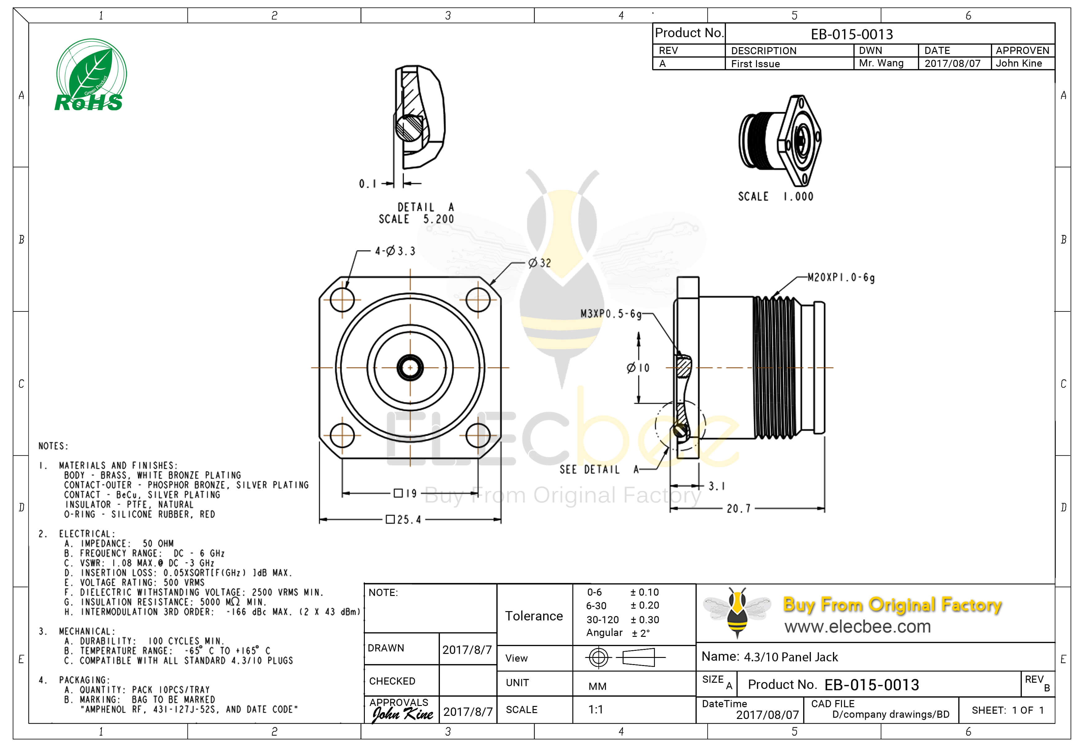 - RF连接器,4.3-10连接器,直式,母头,螺母锁紧,四孔法兰,50欧姆,防水