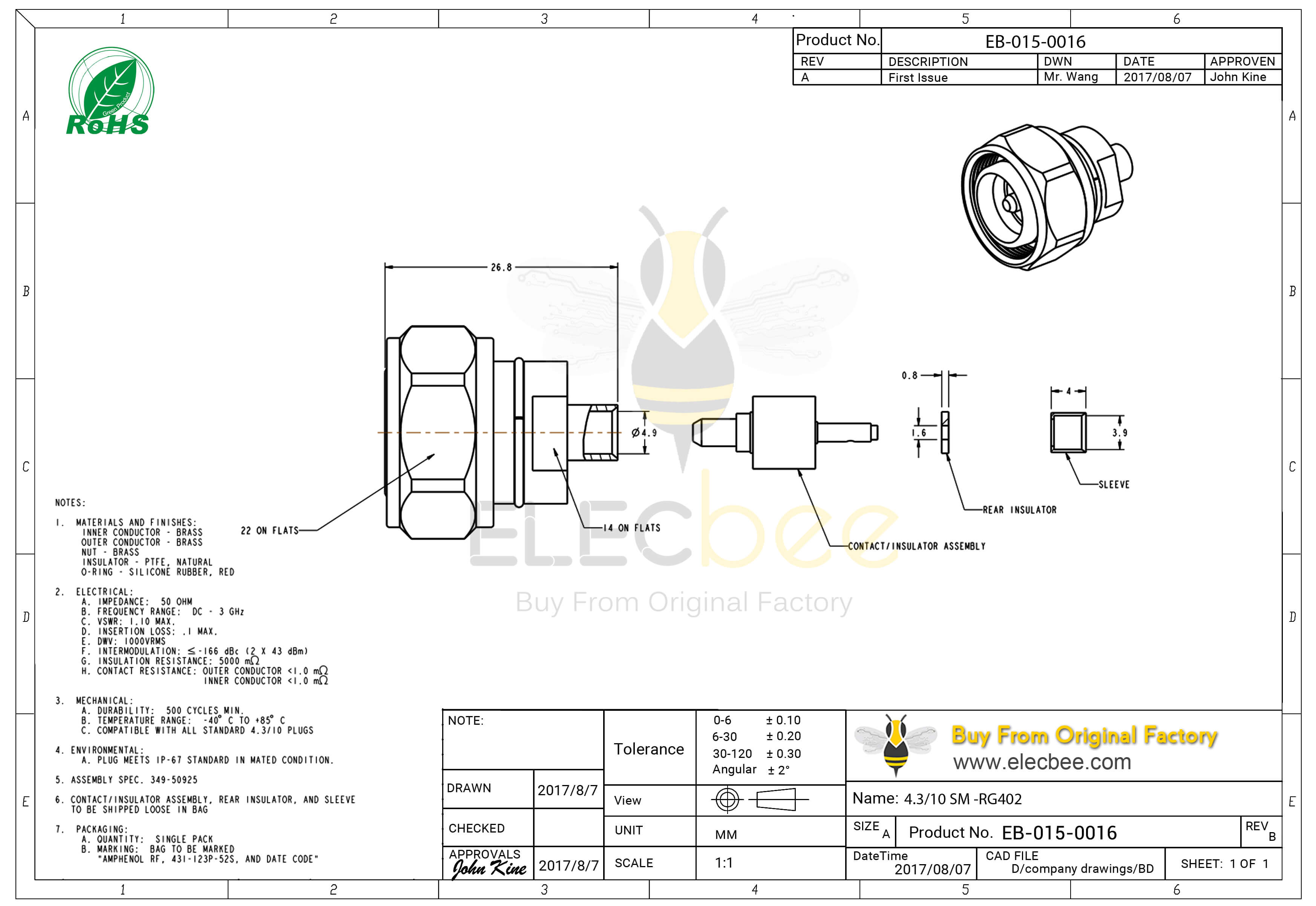 - RF连接器,4.3-10连接器,直式,公头,螺母锁紧,50欧姆,防尘,接.141"半刚性线