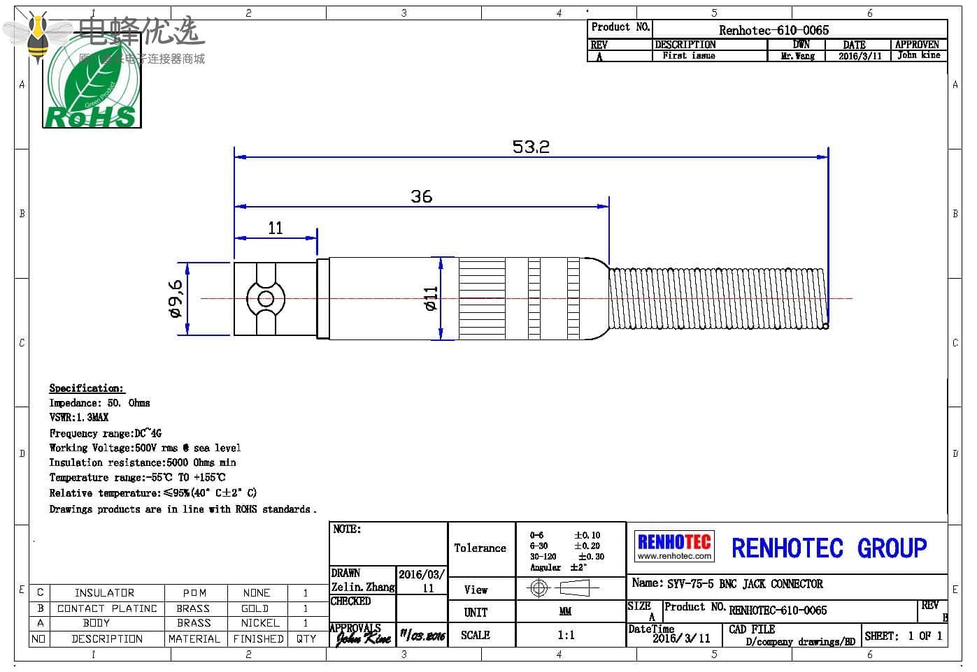 - 连接线,母头,直式,锌合金,50欧姆,RF射频同轴,BNC连接器;