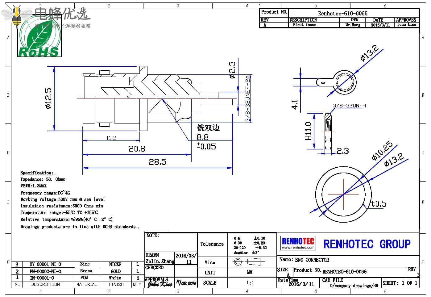 - 中心接触电阻:≦ 1.5 mΩ (Milliohms max.)