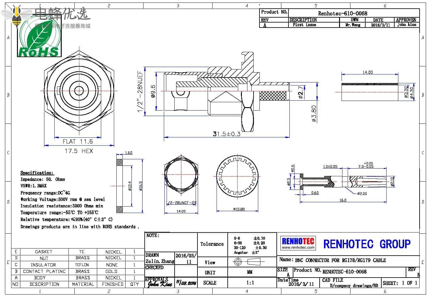 - 连接线,母头,直式,锌合金,50欧姆,RF射频同轴,BNC连接器,电缆,穿墙;