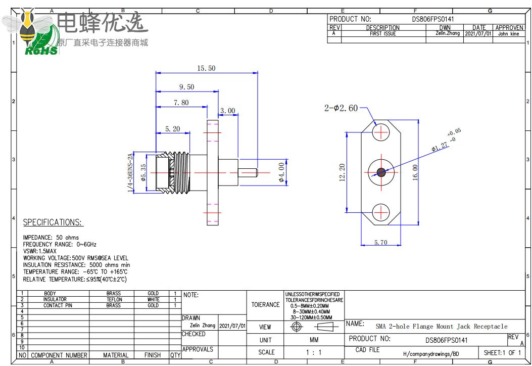 - 耐电压:接RG142,RG405线缆时为1000 V rms