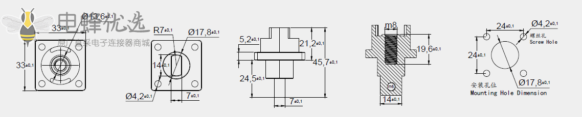 开孔尺寸:φ17,8--φ4.2*4 (24*24mm)
