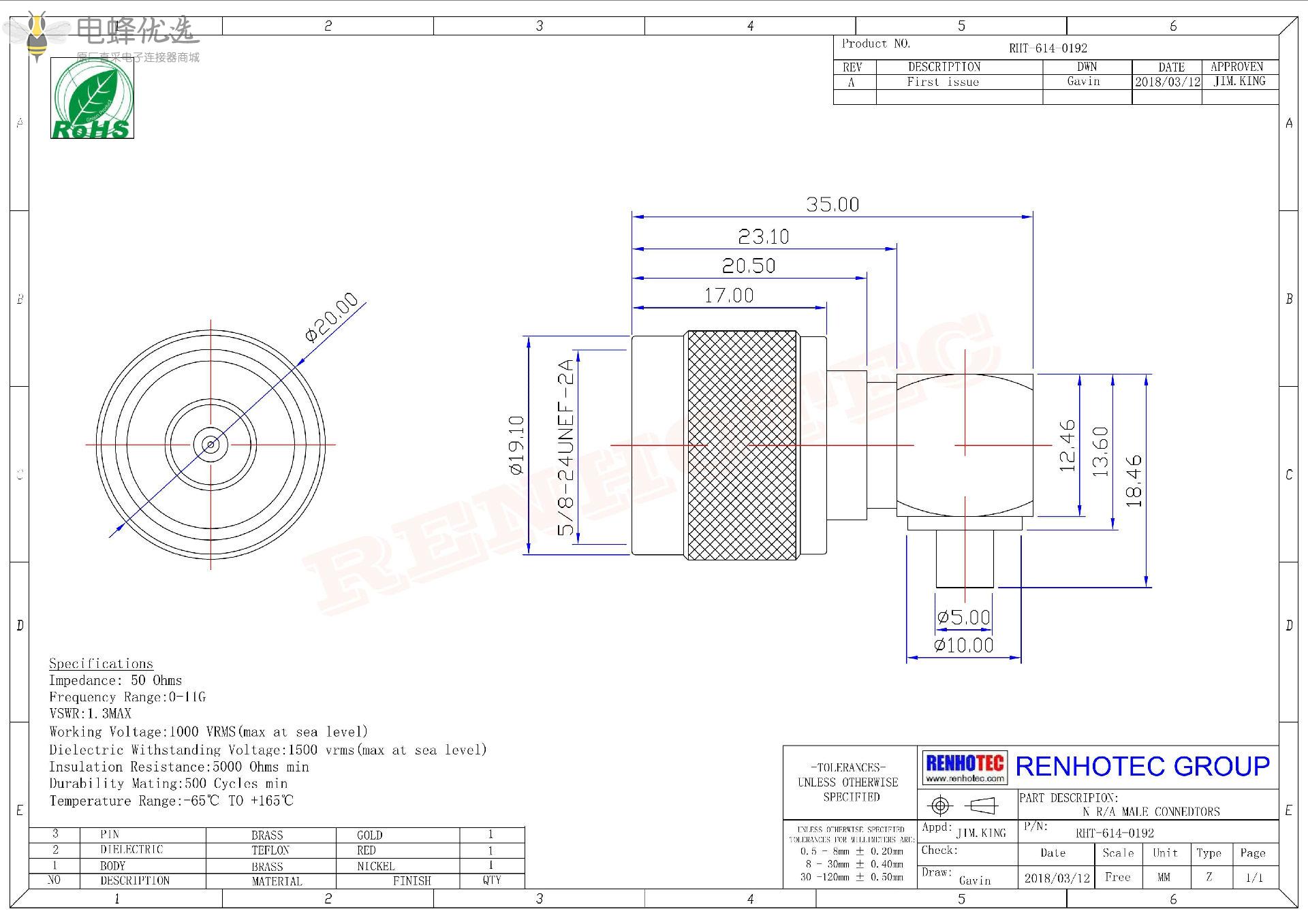 - 高性能连接器,频率范围达0到11GHz,阻抗50欧姆;