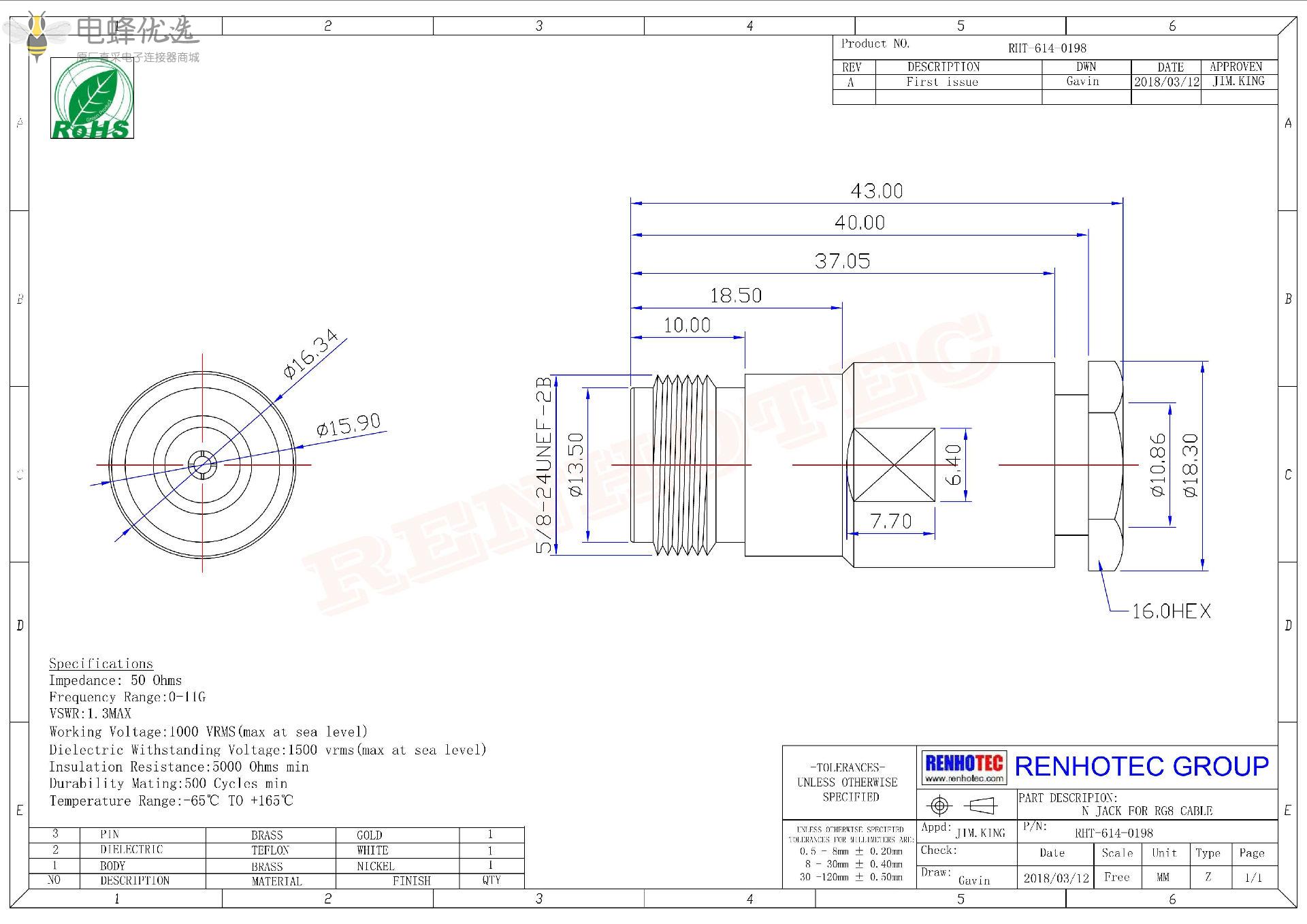 - 高性能连接器,频率范围达0到11GHz,阻抗50欧姆;