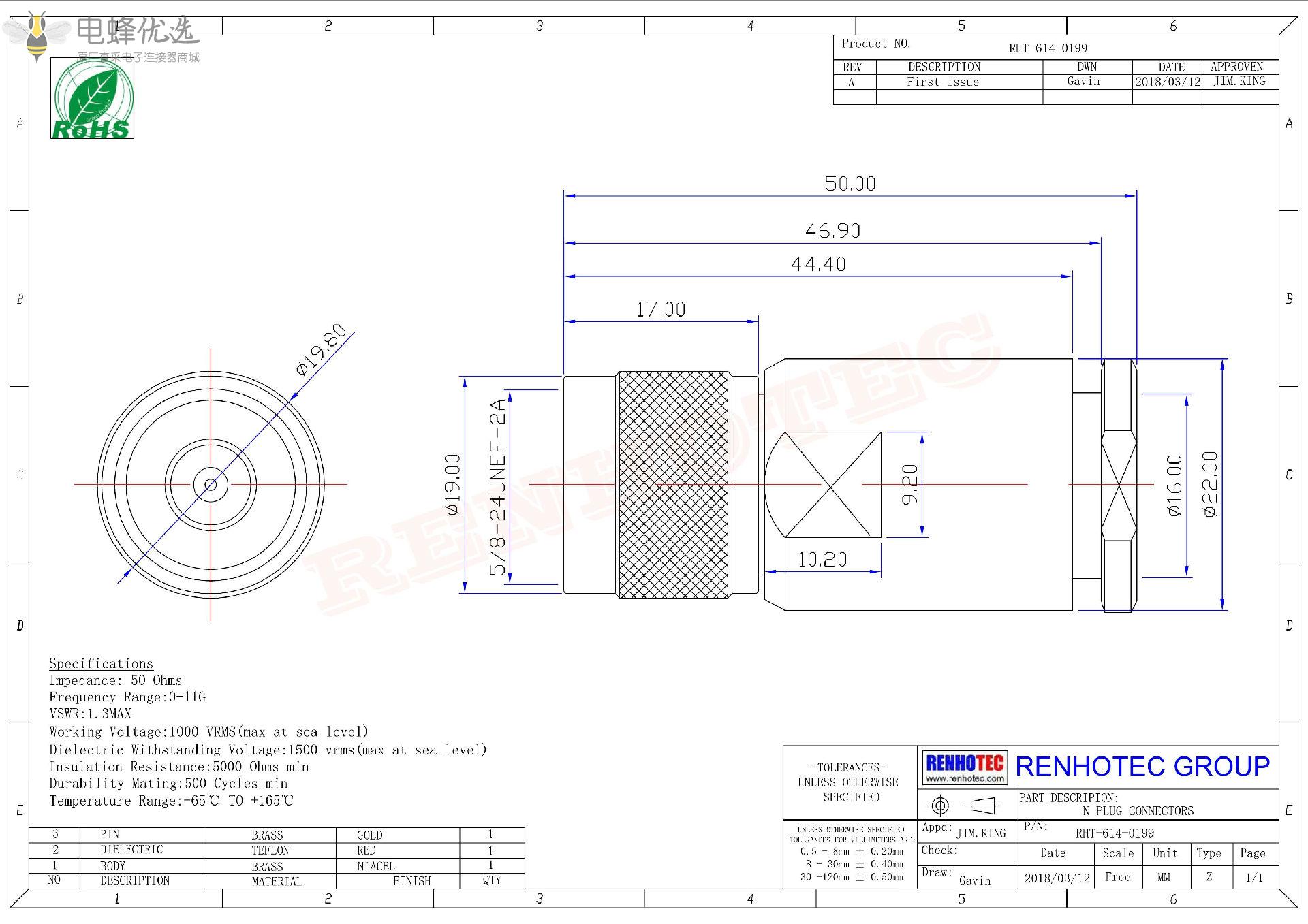 - N型连接器,直式,180度,公头,螺母锁紧,射频同轴连接器;