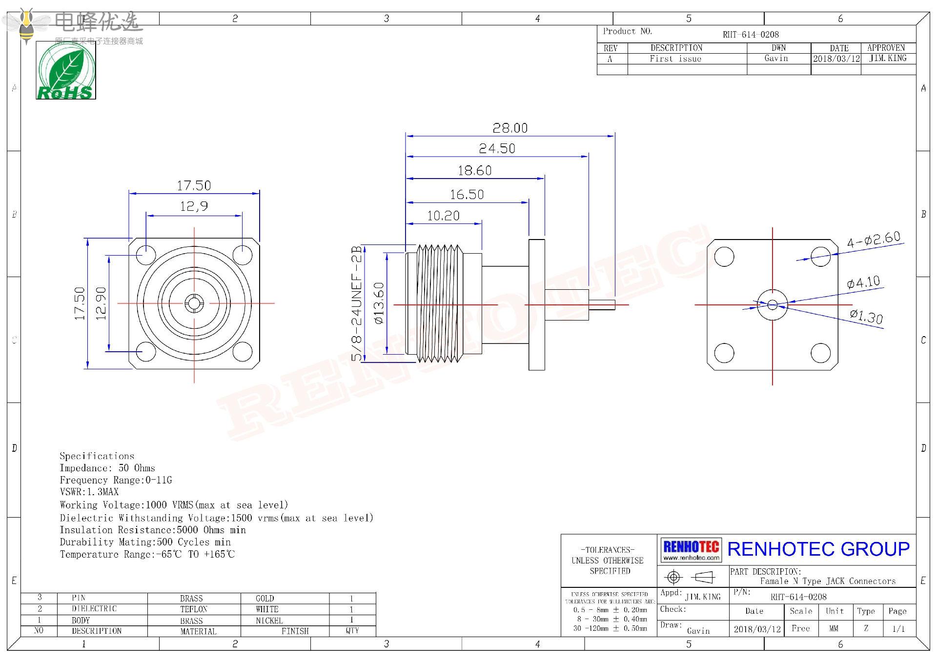 - 中心接触电阻: ≦ 1.0 mΩ (Milliohms max.)