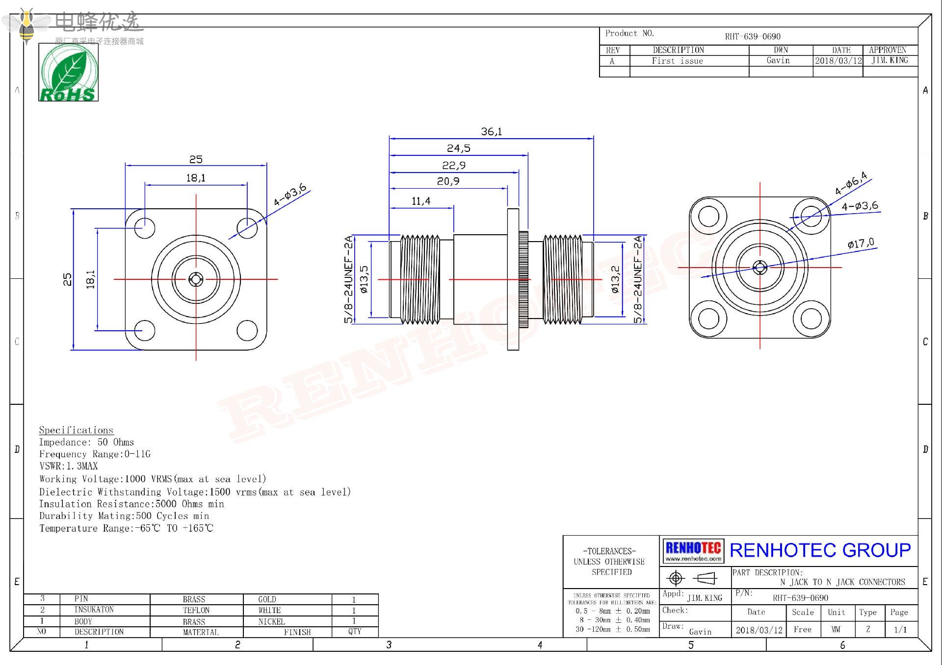 - 中心接触电阻: ≦ 1.0 mΩ (Milliohms max.)