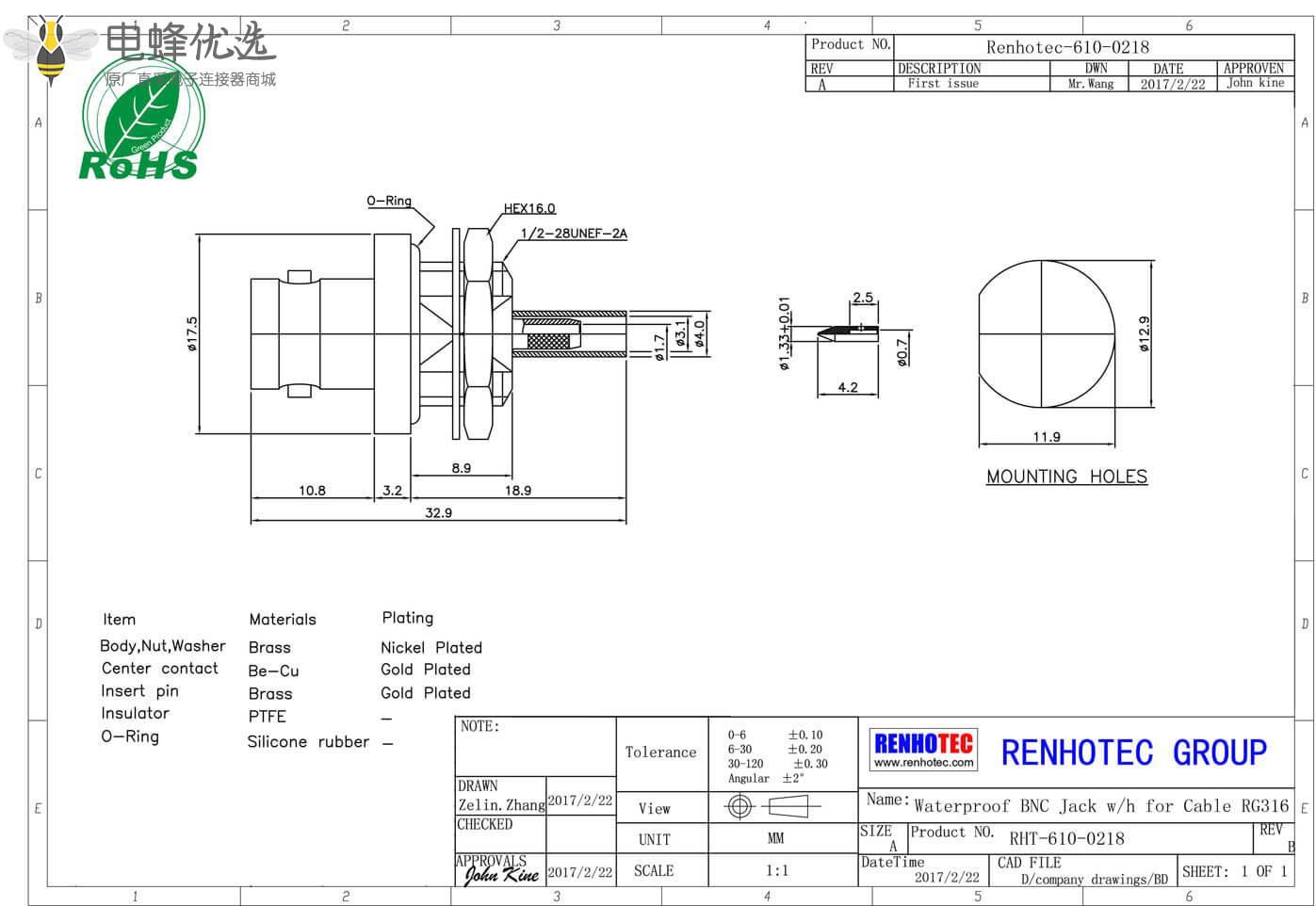 - 中心接触电阻:≦ 1.5 mΩ (Milliohms max.)