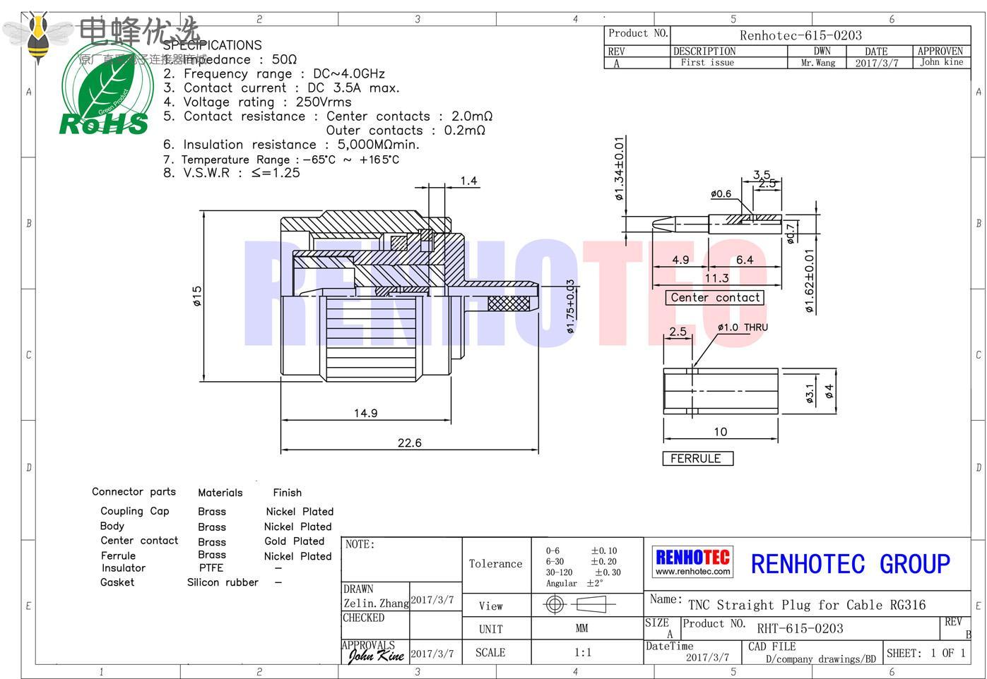 - 同轴线缆,公头,直式,压接,tnc连接器,RG316;