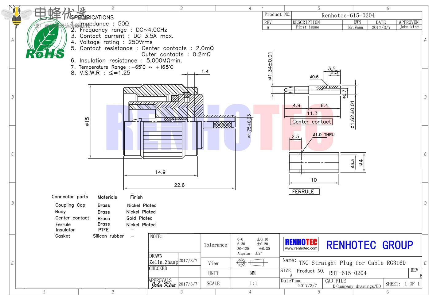 - 同轴线缆,公头,直式,压接,tnc连接器,RG316;
