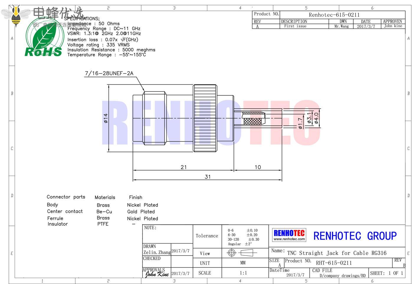- 相对于BNC连接器,具有更高的性能,微波频率达0-11GHz, 阻抗为50ohm;