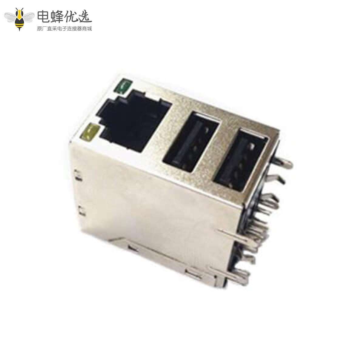 - RJ45和双层USB2.0连接器,母座,PCB板,8P8C,3*1,三层,3口,弯式,屏蔽,不带弹片,带灯,不带滤波器,铜壳,镀镍;