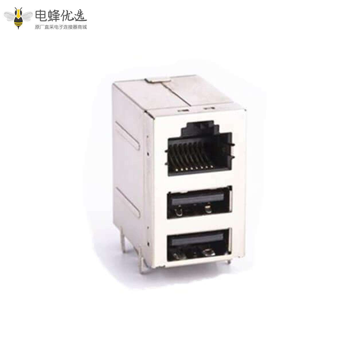 - RJ45和双层USB2.0连接器,母座,PCB板,8P8C,3*1,三层,3口,弯式,屏蔽,不带弹片,不带灯,不带滤波器,铜壳,镀镍;