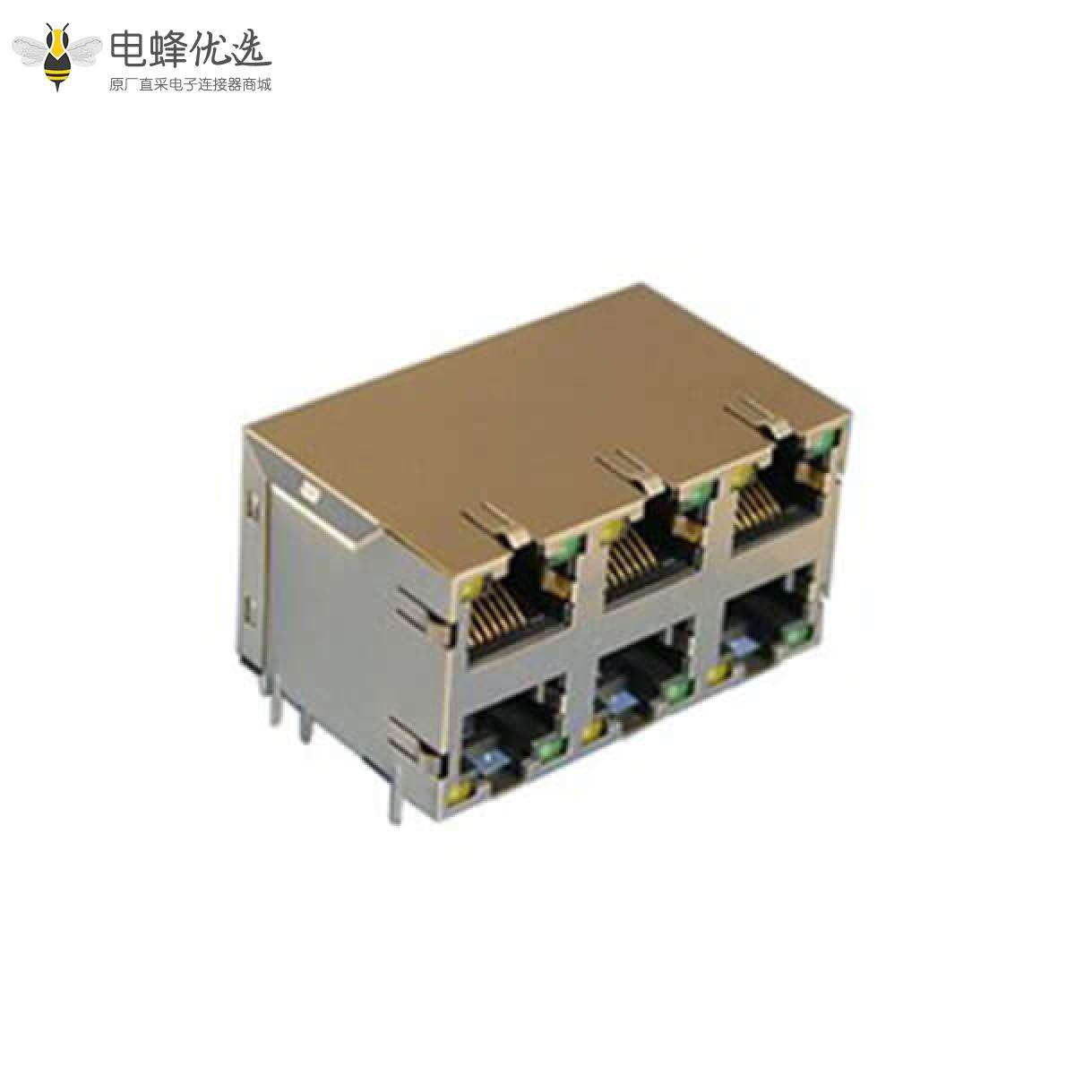 - RJ45连接器,母座,PCB板,8P8C,2*3,双层,6口,弯式,屏蔽,带弹片,带灯,带滤波器,铜壳,镀镍;