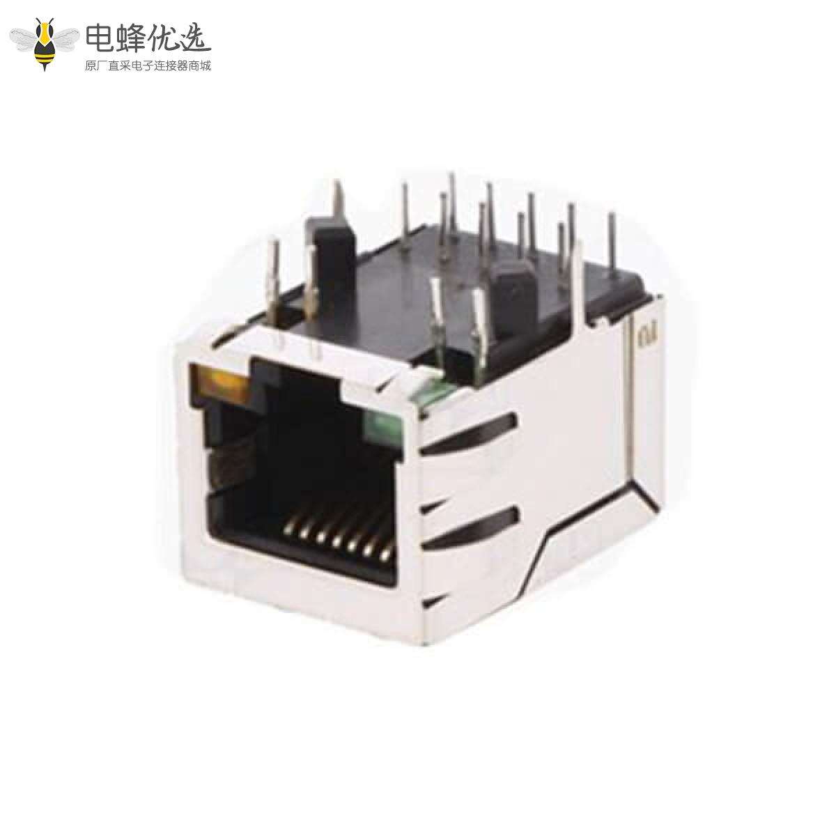 - RJ45连接器,母座,PCB板,8P8C,1*1,单层,单口,弯式,屏蔽,带弹片,带灯,不带滤波器,铜壳,镀镍;