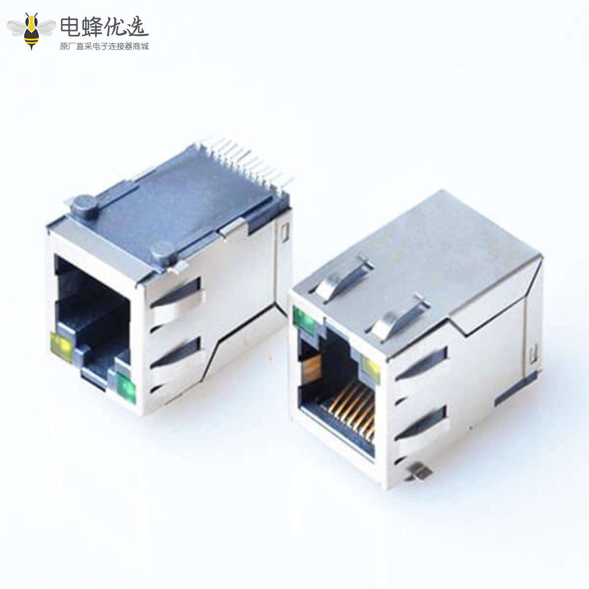 - RJ45连接器,母座,PCB板,8P8C,1*1,单层,单口,沉板式,屏蔽,带弹片,带灯,不带滤波器,铜壳,镀镍;