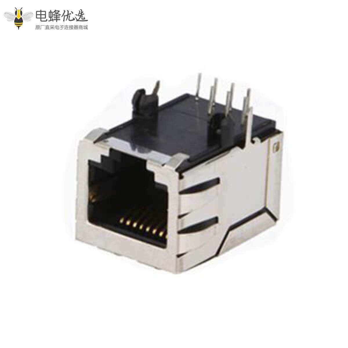 - RJ45连接器,母座,PCB板,8P8C,1*1,单层,单口,弯式,屏蔽,带弹片,不带灯,不带滤波器,铜壳,镀镍;