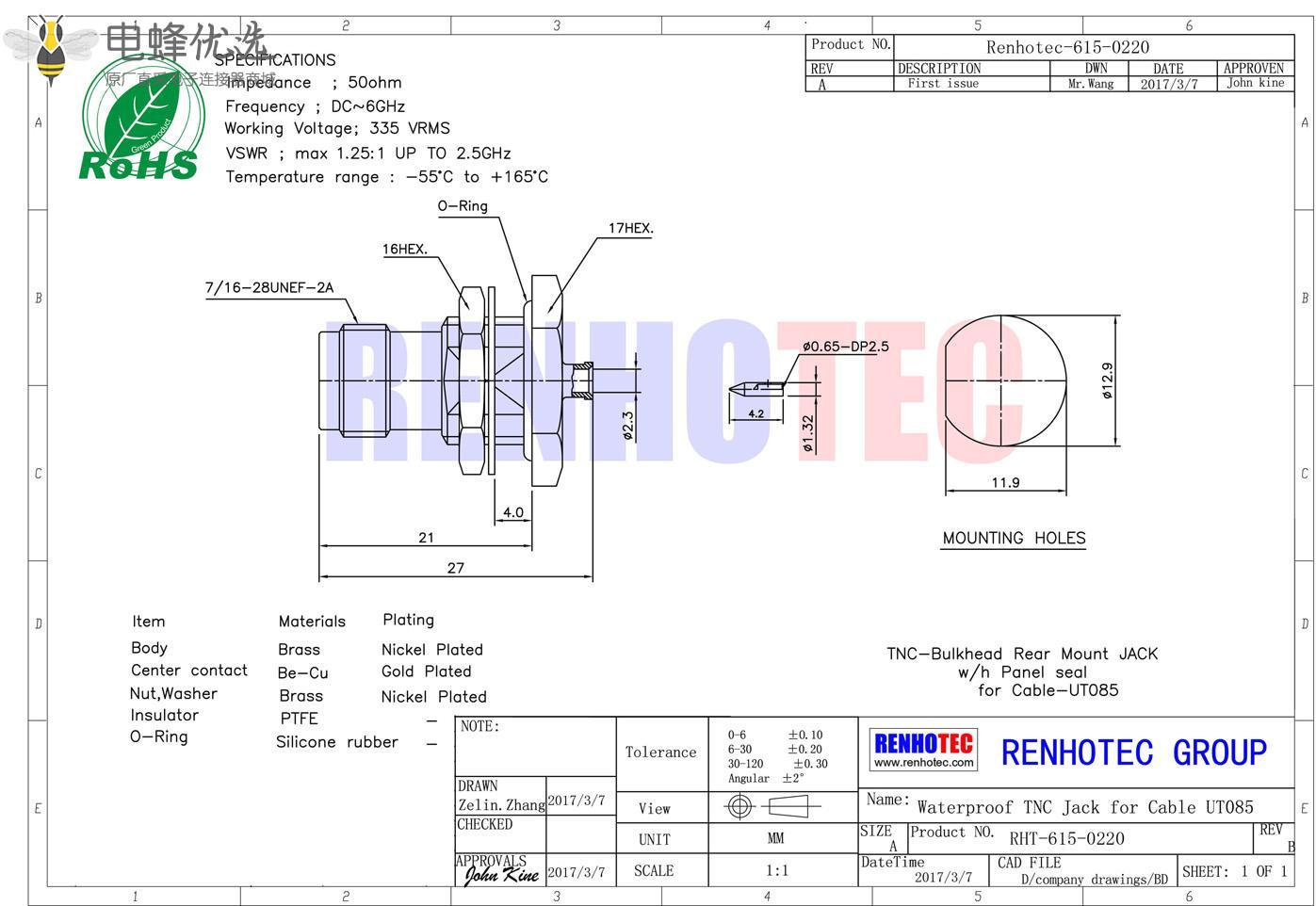 - 同轴线缆,插座,直式,穿墙,tnc连接器,UT085,面板安装,反极;