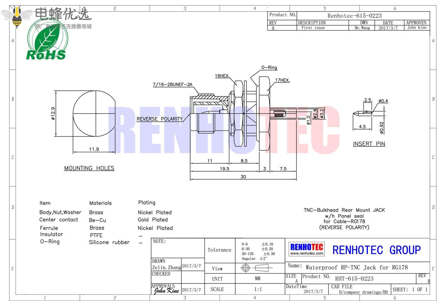 - 同轴线缆,插座,直式,穿墙,tnc连接器,RG178,面板安装,反极;