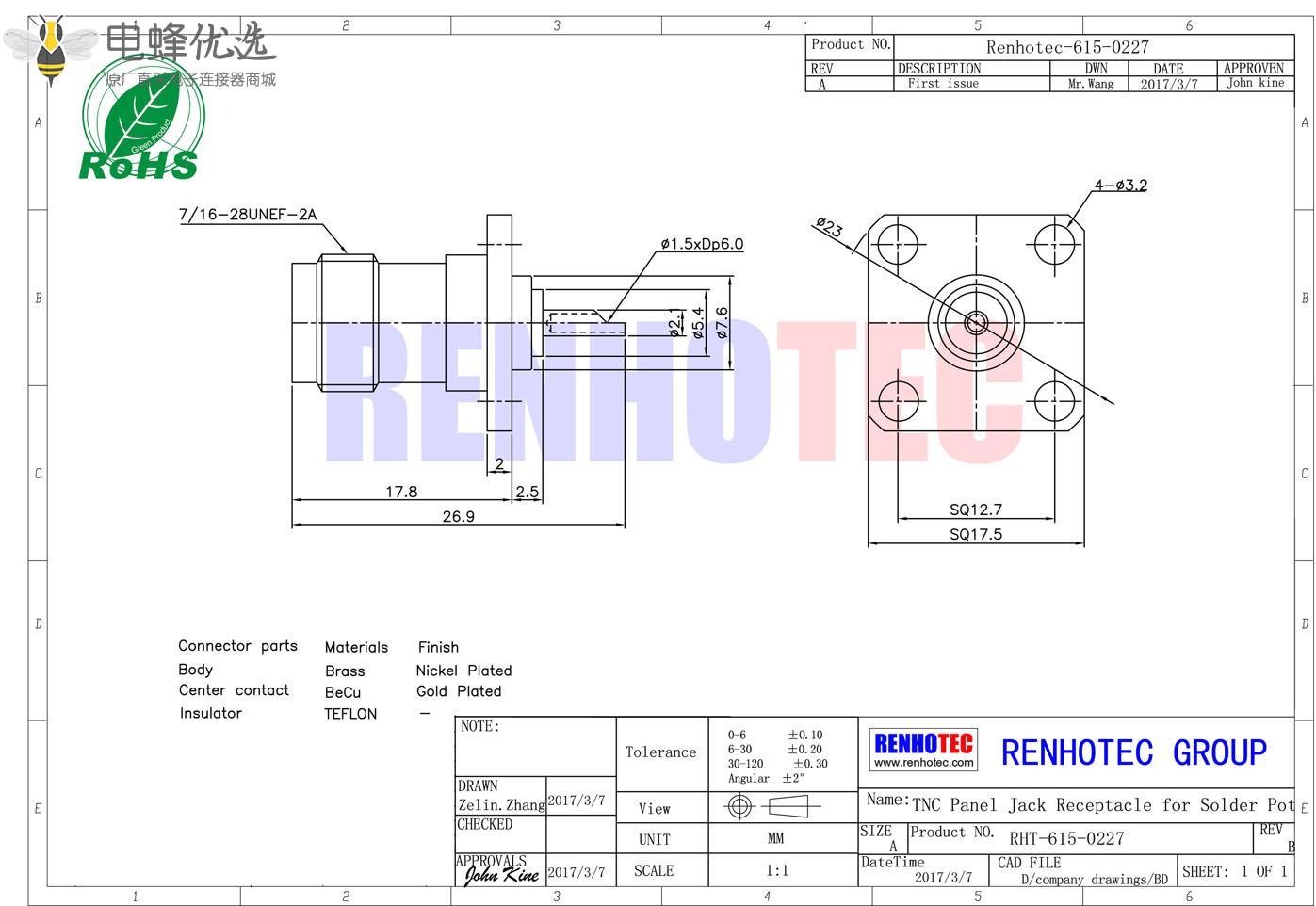 - 面板安装,母头,直式,4孔法兰,tnc连接器;