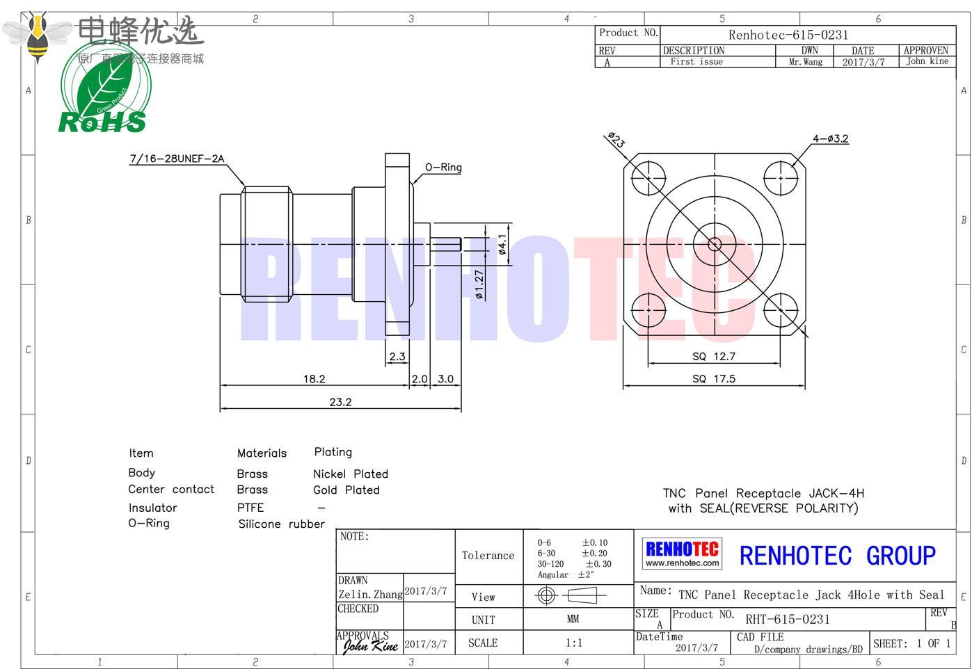 - 面板安装,母头,直式,4孔法兰,tnc连接器;