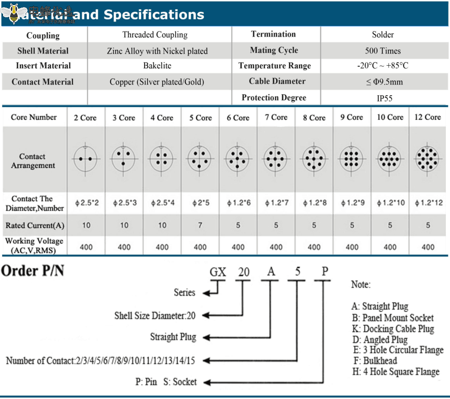 - GX20,对接款,插头,5芯,公/母,直的,接线;