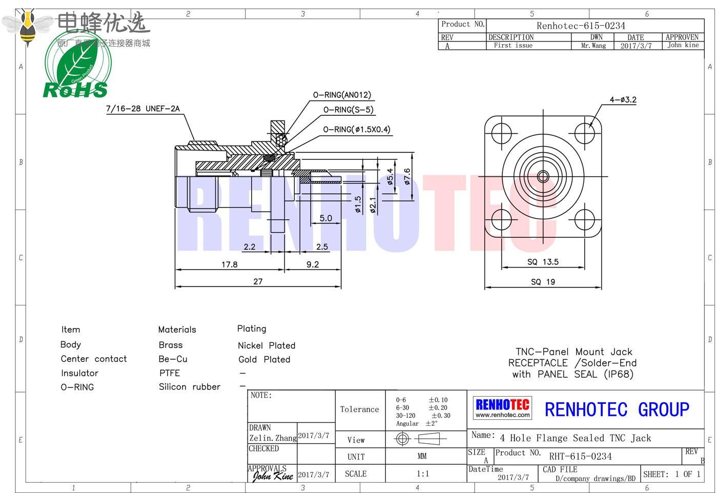 - 面板安装,母头,直式,4孔法兰,tnc连接器;