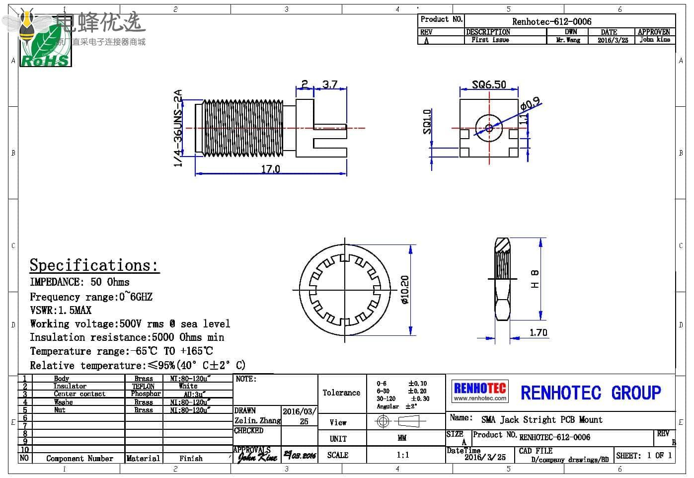接RG142,RG405线缆时为170 V rms - 中心接触电阻:≦ 6.0mΩ (Milliohms max.)