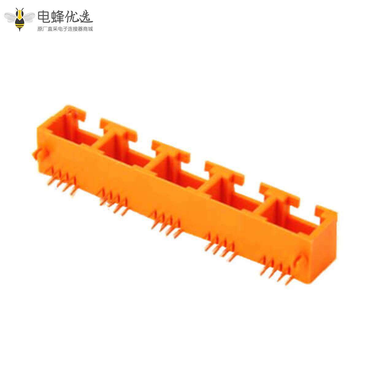 - RJ45连接器,母座,PCB板,8P8C,1*5,单层,五口,弯式,非屏蔽,不带弹片,不带灯,不带滤波器,全塑壳,橙色;
