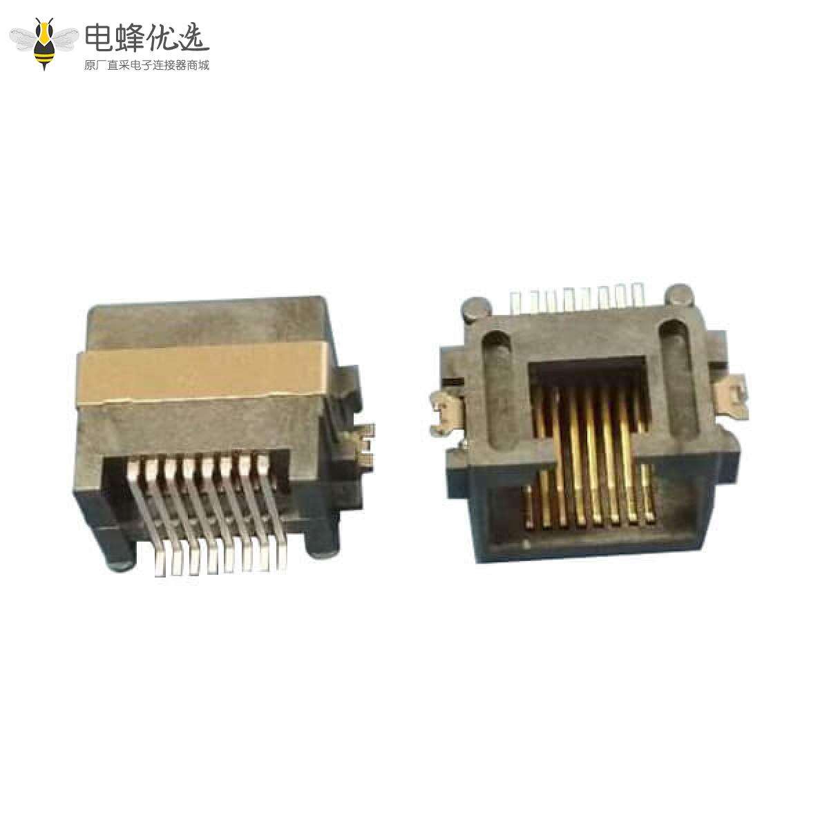 - RJ45连接器,母座,PCB板,8P8C,1*1,单层,单口,弯式,非屏蔽,不带弹片,不带灯,不带滤波器,铜壳,镀镍;