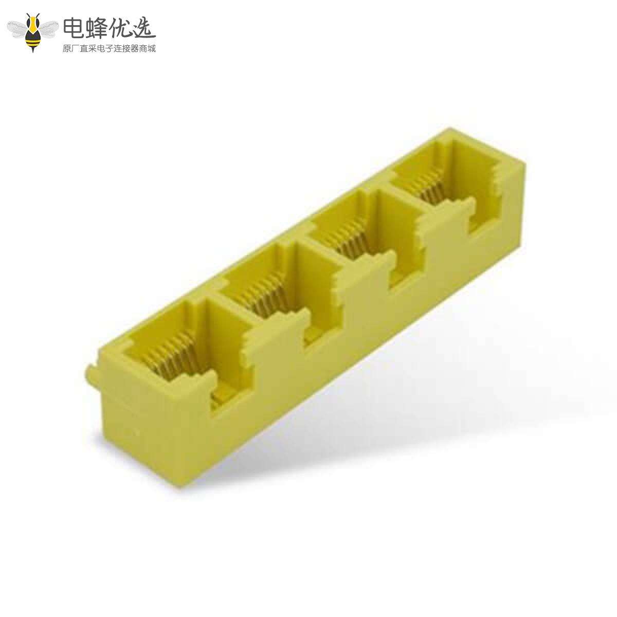 - RJ45连接器,母座,PCB板8P8C,1*4,单层,四口,弯式,非屏蔽,不带弹片,不带灯,不带滤波器,全塑壳,黄色;