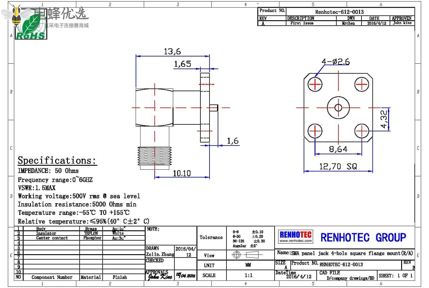 接RG142,RG405线缆时为170 V rms - 中心接触电阻:≦ 6.0mΩ (Milliohms max.)