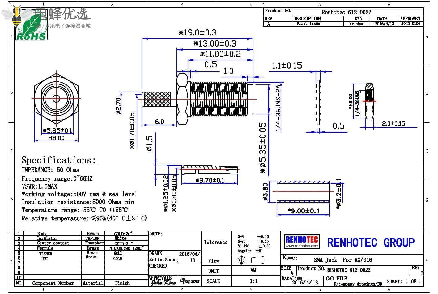 接RG142,RG405线缆时为170 V rms - 中心接触电阻:≦ 6.0mΩ (Milliohms max.)