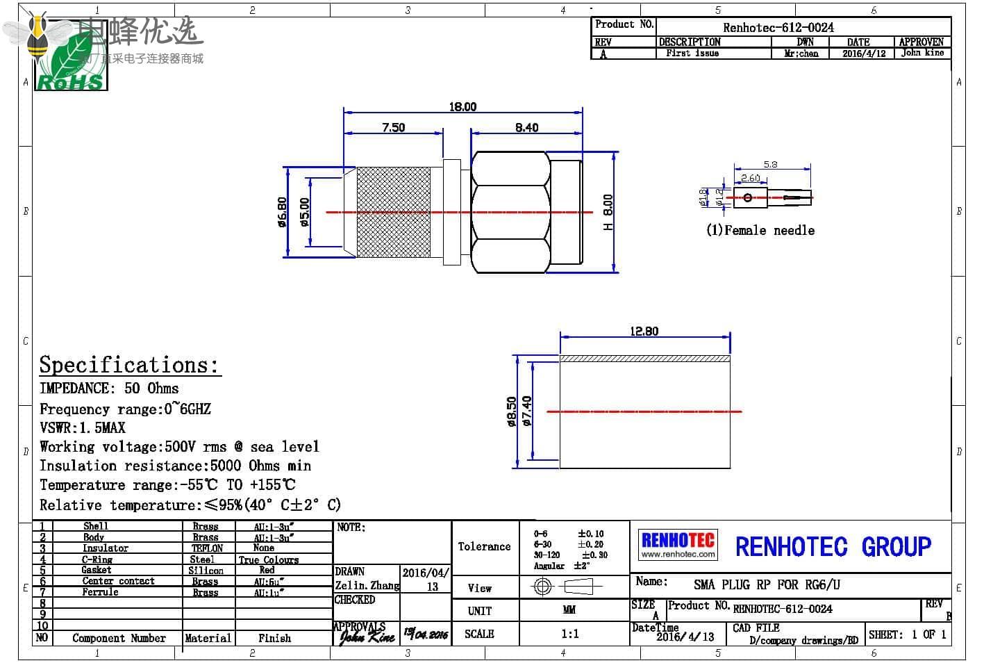 接RG142,RG405线缆时为170 V rms - 中心接触电阻:≦ 6.0mΩ (Milliohms max.)
