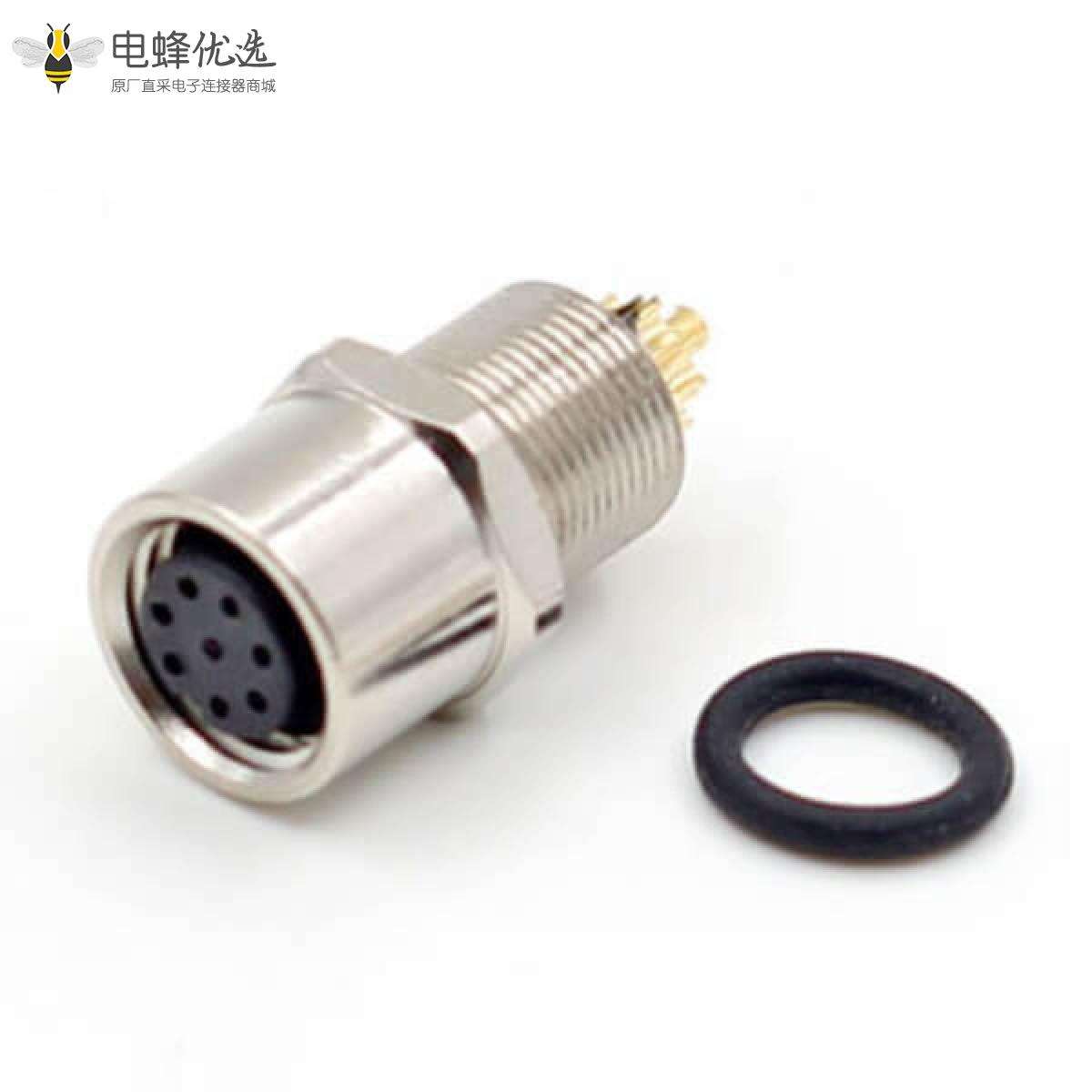 - M8, A编码, 8芯,板端插座, 母,直头, 接线, 焊接式, 后锁板 ;