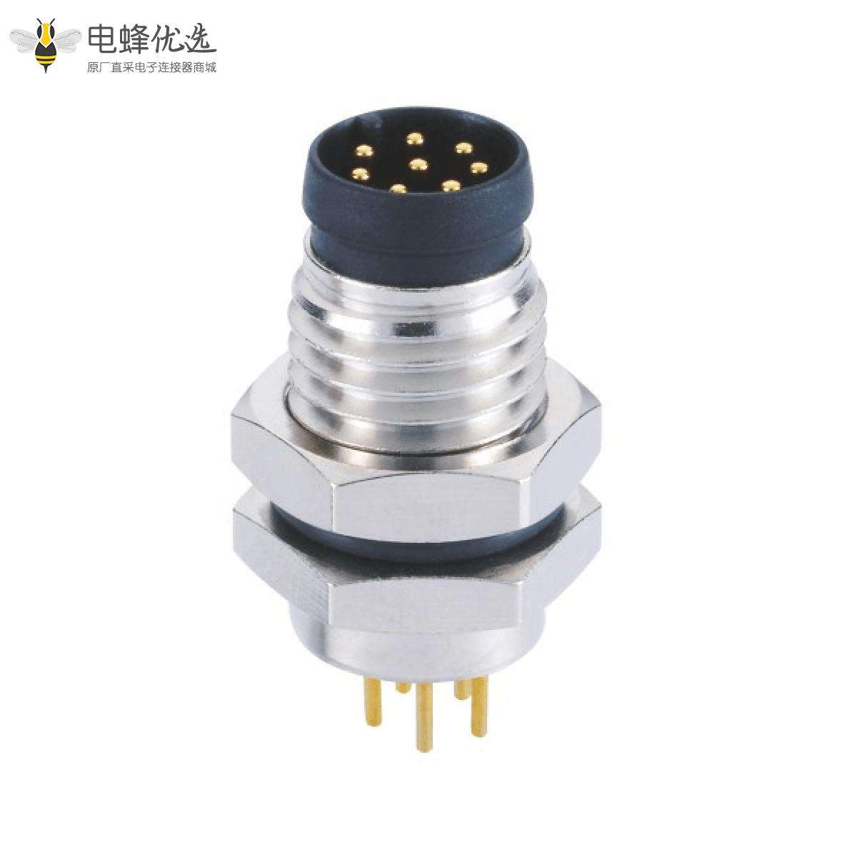 - M8, A编码, 8芯,板端插座, 公, 直头, 接PCB板, 前锁板;